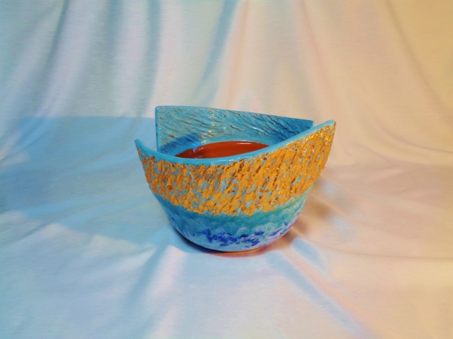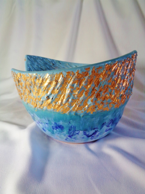Absztrakt kerámia kaspó, egyedi kivitelezés, kék mázazással, rózsa arany fémfüsttel díszítve. Különleges ajándék. átm: 22/19 cm
