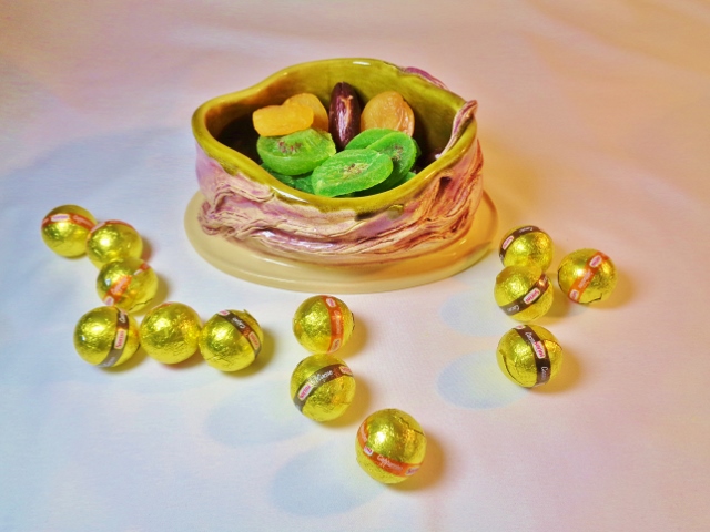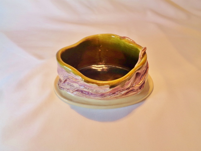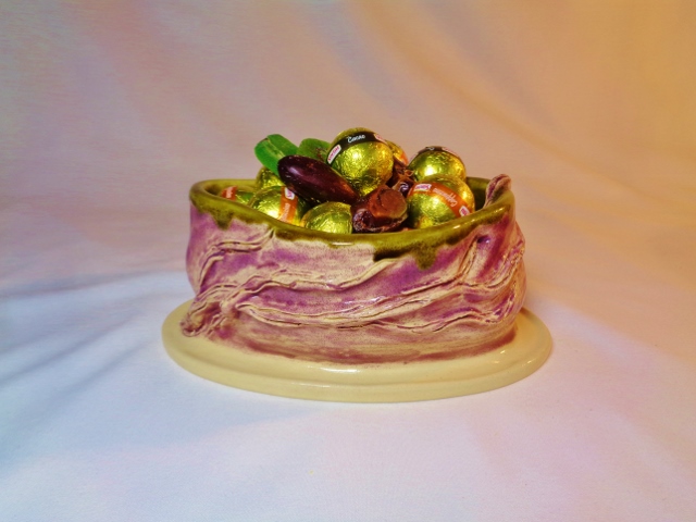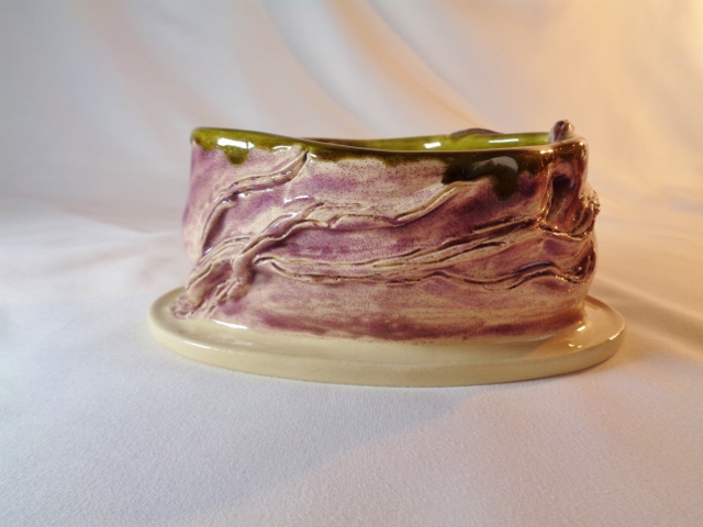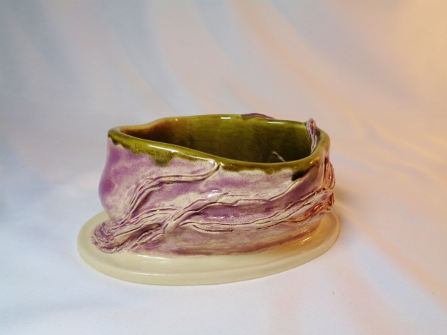 Kerámia ovális cukorka tartó ágak motívumokkal, metál viola lila, olívzöld mázazással. átm: 14/12 cm