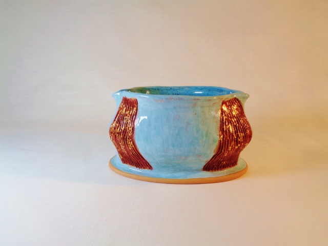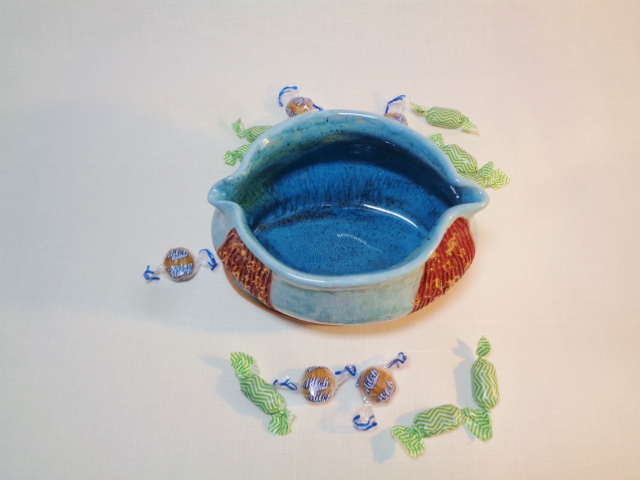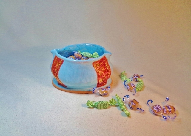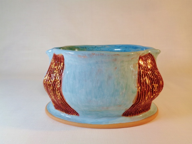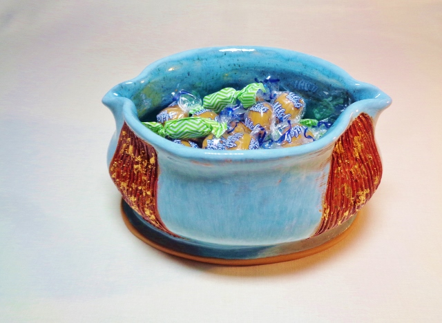Kerámia cukorka tartó ovális forma, Tiffany grün mázazással és rózsa arany fémfüsttel díszítve. átm: 16-12 cm